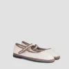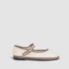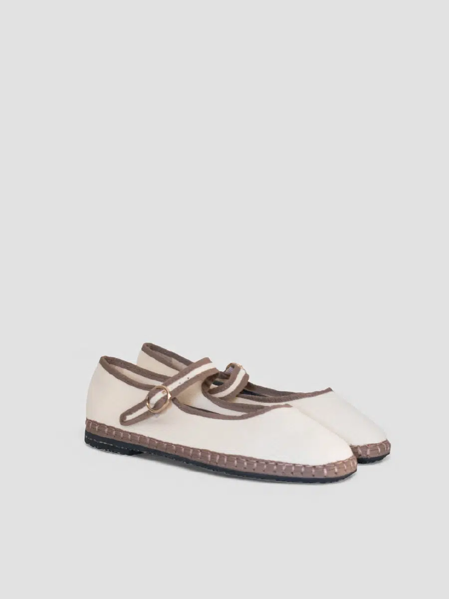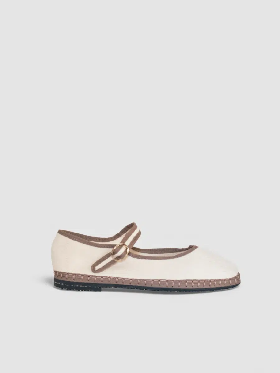 CANDELA. Estas merceditas para mujer están elaboradas en lino de color claro, un material ligero y transpirable ideal para cualquier temporada. Mantienen el diseño clásico de las Mary Jane, con una elegante tira con hebilla metálica en la pala y ribetes en contraste que aportan un toque distintivo.