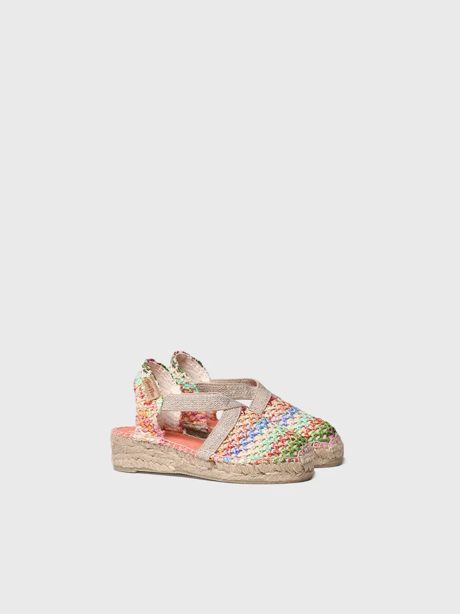 EDITA-NZ. Esta alpargata para niños se elabora en rafia multicolor con cuña de yute, un diseño fresco y sostenible que forma parte de nuestra colección de zapatos ecológicos. La cuña tiene una altura de 3 cm y la base de la suela está fabricada en goma antideslizante, ofreciendo seguridad en cada paso. La planta interior está forrada en tejido y el modelo cuenta con bandas elásticas que proporcionan una gran sujeción al pie. Su confección artesanal, cosida a mano en España, resalta la calidad del calzado. Además, es un modelo vegano que combina estilo, comodidad y respeto por el medio ambiente. Esta alpargata calza la talla habitual; si estás entre dos tallas, te recomendamos escoger la más grande.