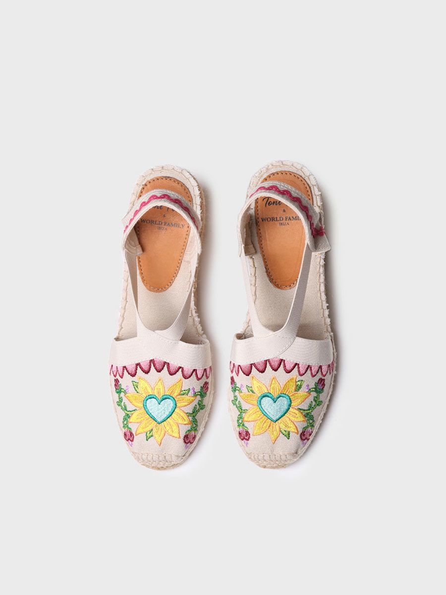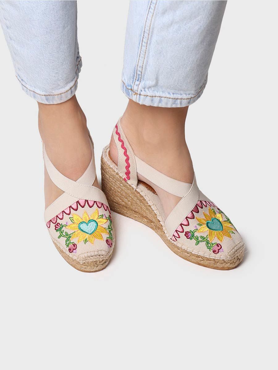 Alpargatas de cuña mujer GARDENIA. Este modelo de alpargatas cerradas para mujer está confeccionado en lona de algodón con bordados multicolor, ofreciendo un toque distintivo. Las sandalias cerradas cuentan con tiras elásticas de color turquesa que se cruzan en la parte superior para brindar un excelente soporte al pie. La cuña de yute tiene una altura total de 8,5 cm, de los cuales 1,5 cm corresponden a la suela y 7 cm al tacón. La suela interior está forrada en tela y presenta una plantilla de piel para un look más cómodo. Este modelo, que combina la tradición y el estilo, está cosido a mano siguiendo el proceso tradicional de elaboración de sandalias punta cerrada. Se ajusta a la talla; Si estás entre dos, te recomendamos elegir la talla más grande.