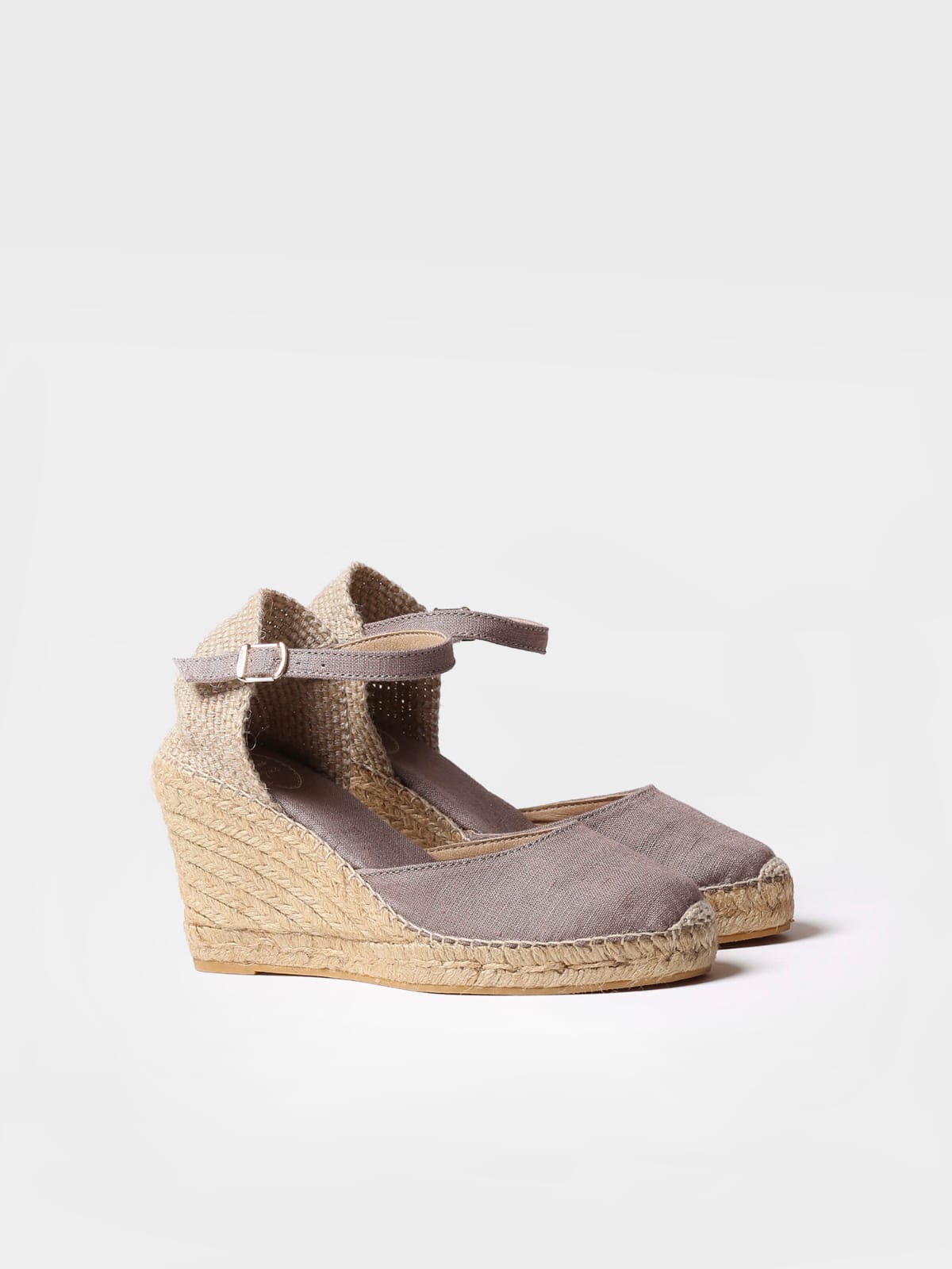 Alpargatas planas plataforma PORTBOU de TONI PONS. Esta alpargata para mujer, confeccionada en lino, se elabora en tonos lisos. La cuña tiene una altura total de 9 cm, de los cuales 7 cm pertenecen al tacón y 2 cm a la suela. Toda la cuña exterior está hecha de yute y goma, mientras que la suela interior está forrada en tejido para mayor comodidad. La unión del lino y la suela está cosida a mano con un hilo de algodón y cuenta con un refuerzo en la punta para mayor sujeción. Ideales como sandalias cerradas y cuñas mujer, perfectas para cualquier ocasión.