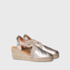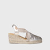 Sandalias cuña TOSSA de TONI PONS. Esta alpargata para mujer presenta un elegante diseño en piel y colores metalizados, con forro textil transpirable. La cuña tiene una altura total de 6 cm, con 4 cm de tacón y 2 cm de suela. La cuña exterior está hecha de yute y goma, mientras que la suela interior está forrada en piel, brindando gran comodidad. La unión de la piel y la suela está cosida a mano con hilo de algodón de alta calidad. Además, cuenta con dos elásticos que garantizan una perfecta sujeción al pie, convirtiéndola en una de las mejores alpargatas de cuña mujer.