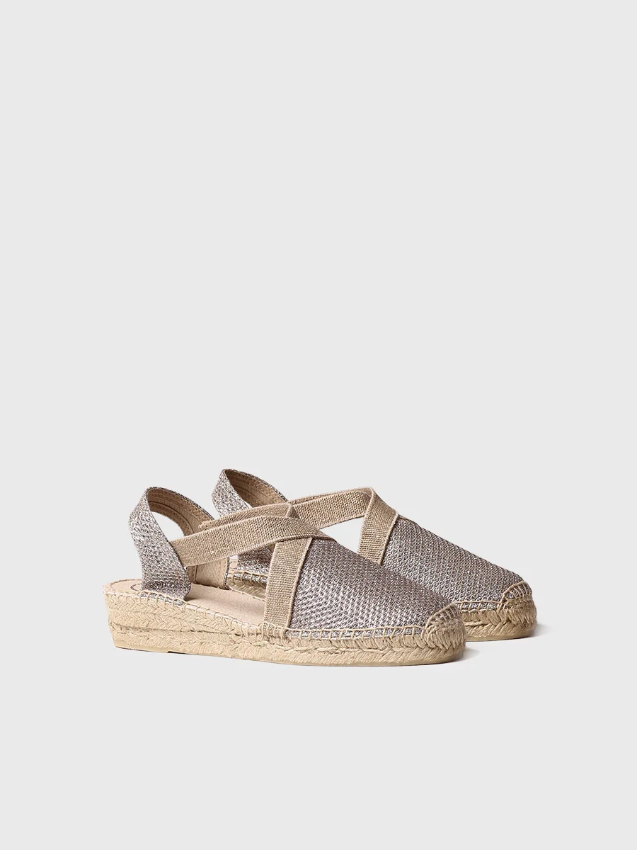 Sandalias cuña mujer VELINO de TONI PONS. Esta alpargata para mujer está elaborada en tejido brillante que cambia de tono según el movimiento. La cuña tiene una altura total de 4,5 cm, de los cuales 2,5 cm corresponden al tacón y 2 cm a la suela. Toda la cuña exterior está hecha de yute y goma, garantizando durabilidad y estilo. La suela interior está forrada en tejido, lo que le otorga una gran comodidad. La unión del tejido y la suela está cosida a mano con un hilo de algodón de alta calidad. VELINO es un modelo de sandalias cerradas extremadamente cómodo, y los elásticos cosidos al tejido proporcionan una sujeción excepcional del pie. Su amplia gama de colores permite combinarlas fácilmente, convirtiéndolas en las cuñas de esparto ideales para cualquier ocasión.